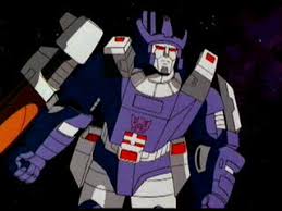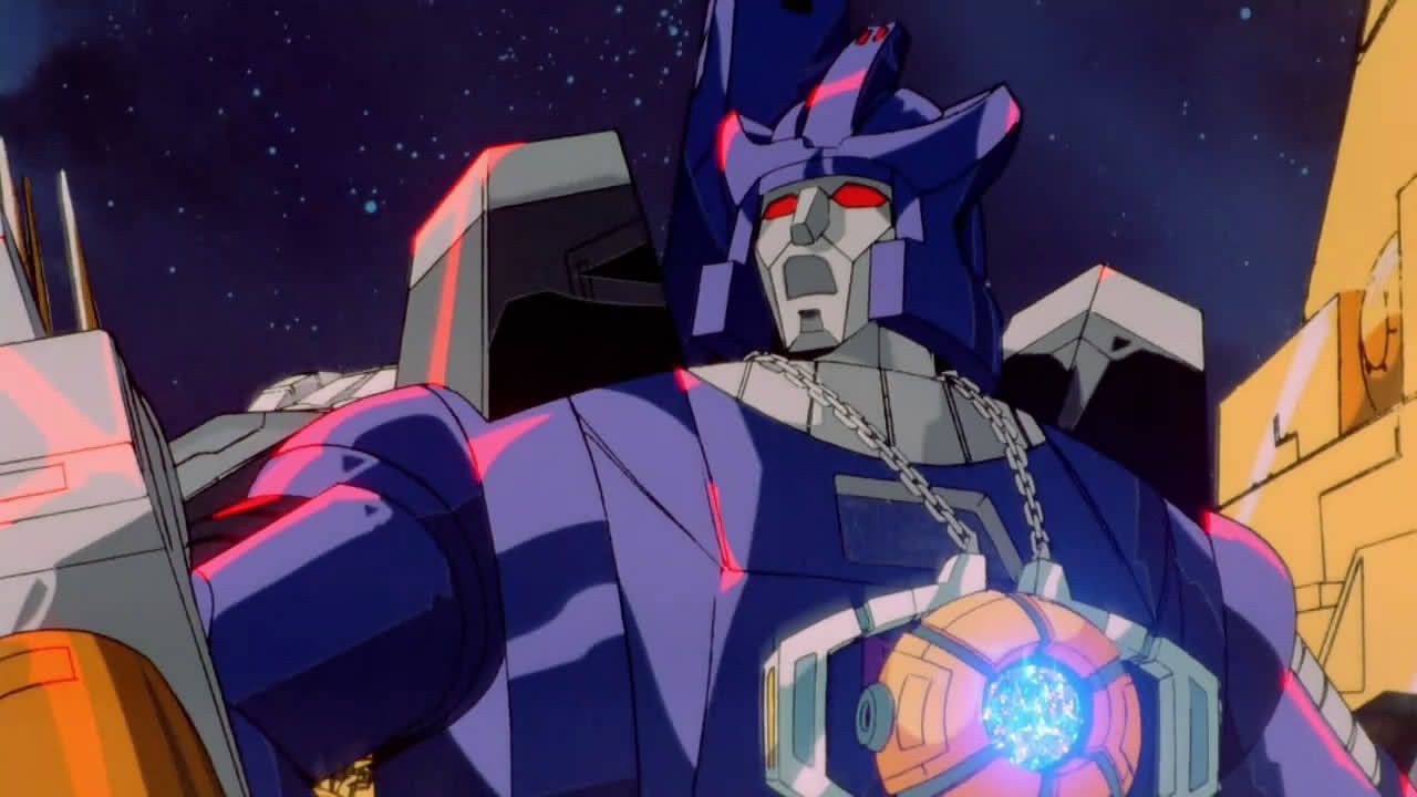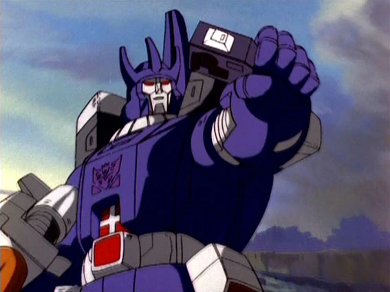 After being mortally damaged by Optimus Prime and jettisoned into space by Starscream, Megatron is discovered by Unicron. In exchange for his loyalty, Unicron rebuilds him into a new, immensely powerful form: Galvatron. He immediately asserts his authority by destroying Starscream during the latter’s coronation ceremony.